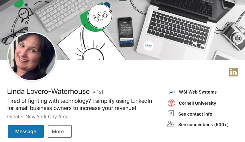 But even if you don’t have a company page, having a name for even a solo gig is useful. Apart from the fact that people prefer doing business with a company (even if it’s small), this is important since your current company’s name appears on your profile snapshot. In this image below, Linda’s profile snapshot shows her current company as WSI Web Systems, which is at the top of her experience.
